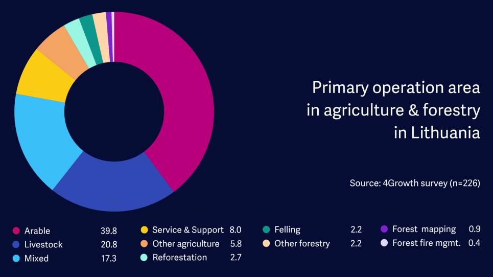 4Growth survey data show that Lithuanian respondents are primarily producers (farmers and foresters), with the survey sample closely reflecting the national agricultural landscape: 39.8% arable agriculture, 20.8% livestock, and 17.3% mixed operations. Forestry activities, including reforestation, felling, forest inventory and fire management, represent a smaller share.