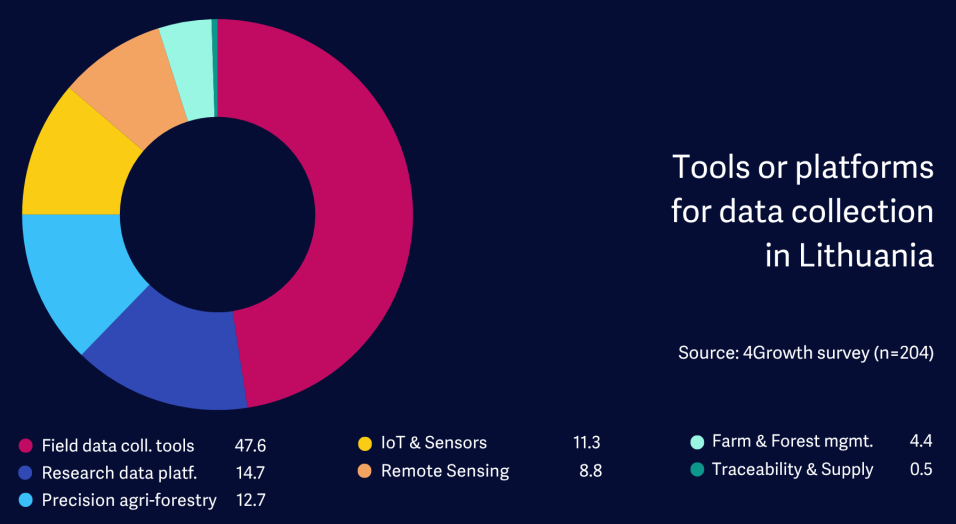 In Lithuania, this figure is slightly lower at 47.5%, with adoption largely centered on tools supporting farm management and field data collection. Field data collection tools dominate usage (47.6%), followed at a distance by research data platforms (14.7%), precision agriculture and forestry technologies (12.7%), and IoT devices and sensors (11.3%). This distribution highlights a strong focus on operational data capture, with more advanced or interconnected technologies still gaining ground.
