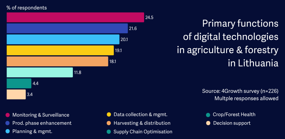 In Lithuania, these technologies are most frequently used for: Monitoring and Surveillance (24.5%), Production Phase Enhancement (21.6%), and Planning and Management (20.1%). Decision-support, planning and supply chain optimisation round out the picture.