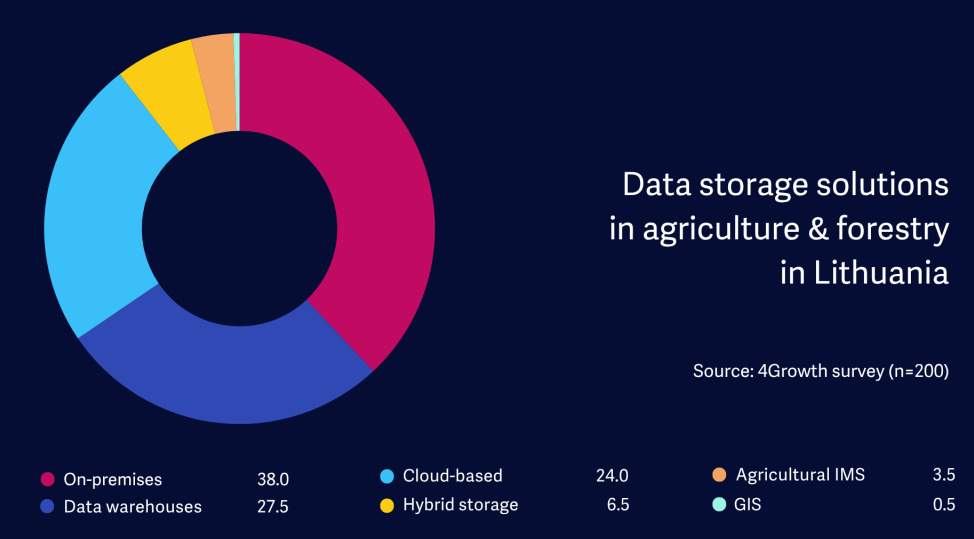 The way agri-forestry data is stored also influences its future usability and shareability. In Lithuania, 38.0% of respondents rely on on-premises or local storage as their primary solution — mirroring the European survey average and underlining continued data fragmentation across the sector.